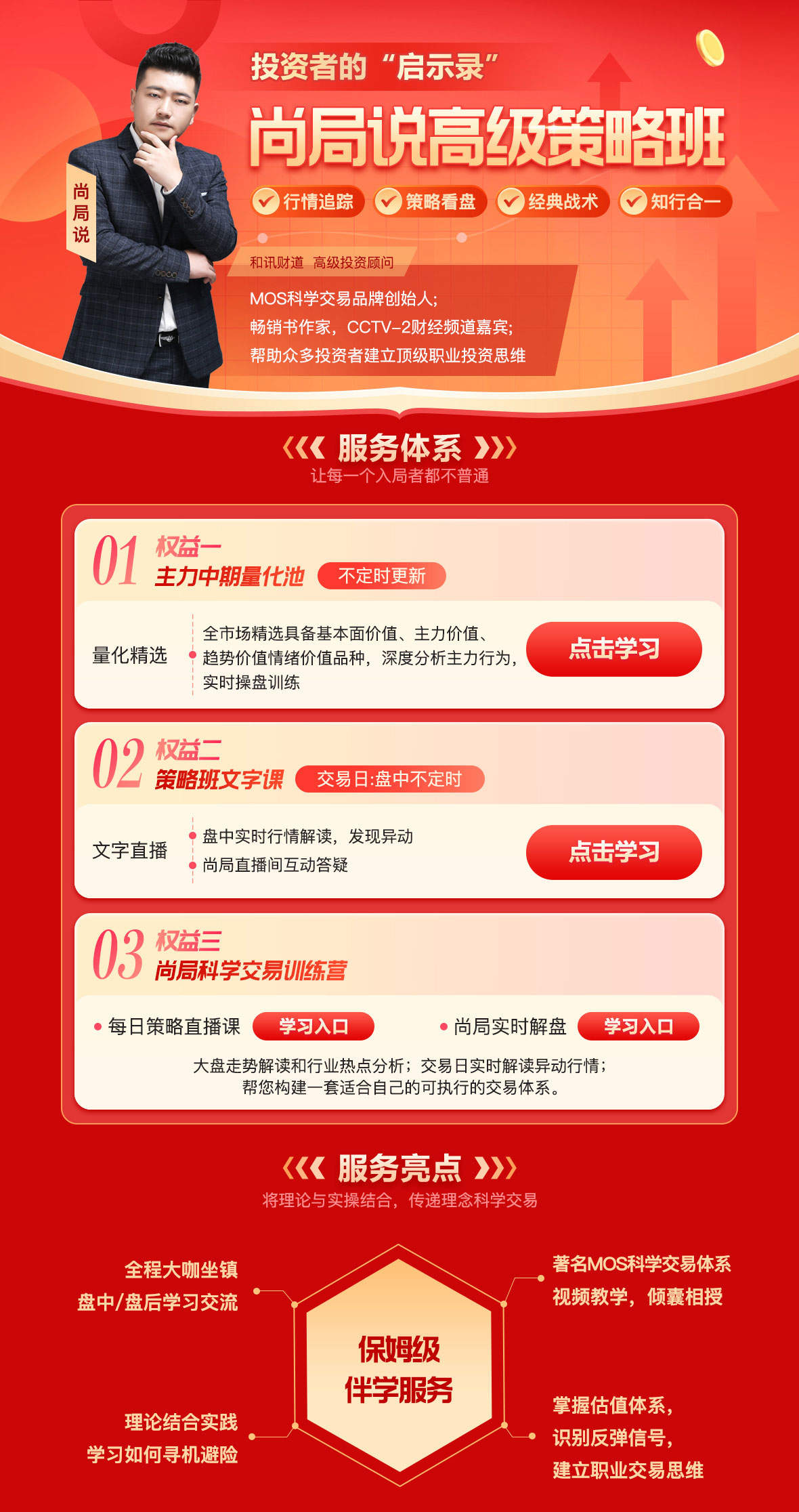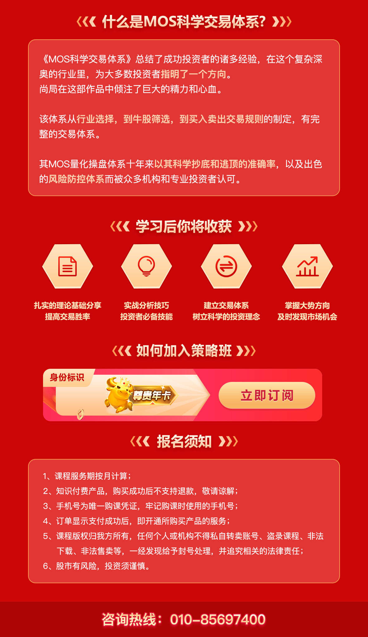 本栏目课程内容包含:大盘走势解读和行业热点分析;交易日实时解读异动行情;通过MOS科学交易体系实操教学,帮您构建一套适合自己的可执行的交易体系。