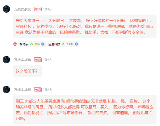 另外,再说一个选股的问题。28号我在内部提醒,宝通科技和蜂助手虽然抗跌,但并不适合格局持有,建议大家在冲高时逐步离场。