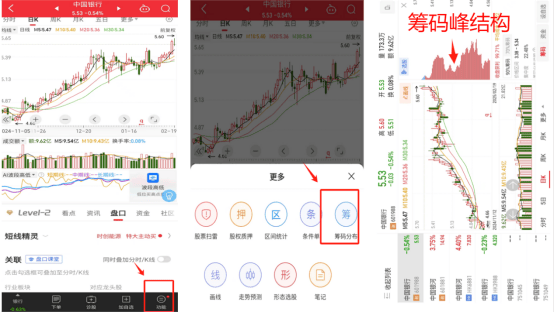 手机端查看筹码峰,以同花顺APP为例,可以在进入个股的交易界面后,点击右下角功能,选择筹码分布,就会自动跳出来筹码峰结构。