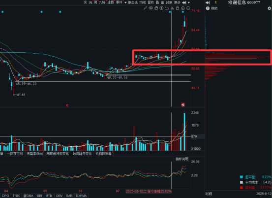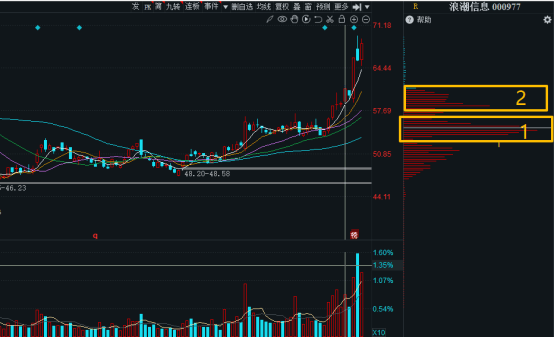 浪潮信息股价在这个位置持续横盘震荡,形成了一个红色的顶格筹码峰。这个就叫做主力的建仓峰。