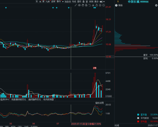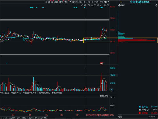 中国长城股价在相对低位形成的一个红色顶格筹码峰,我们称之为主力的建仓峰。