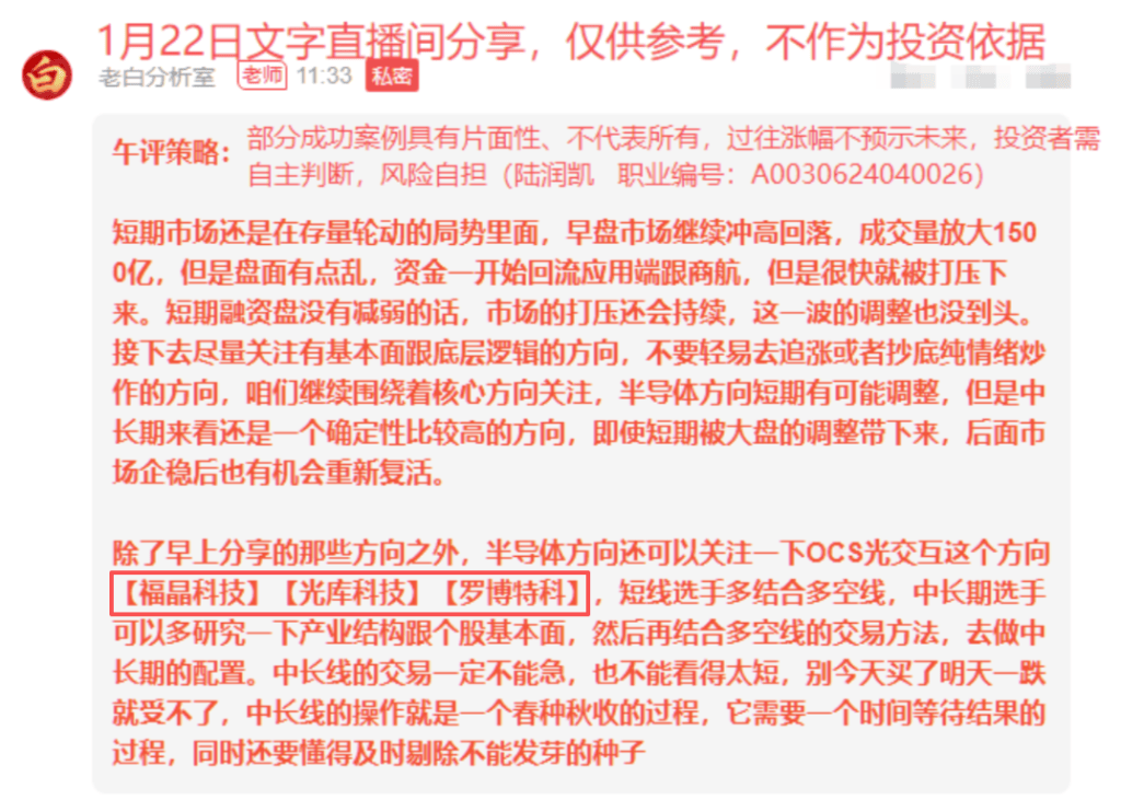 其中所有免费浏览内容由投顾服务人员或团队发布(包含但不仅限于和讯自有投顾人员),均仅代表其对市场所持观点,所载内容、数据仅供参考,参阅文字交流信息、资料及图表的人士,应考虑投资市场风险性。投资者依据本平台提供的信息、资料及图表进行金融、证券等投资项目所造成的盈亏与公司无关。不承诺投资者获取投资收益,也不与投资者约定分享投资收益或分担投资损失。本服务所提供的文字信息、资料及图表仅供参考,并不构成对任何股票的收购、购买、认购、抛售或持有的邀约或意图。