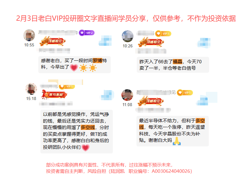 今天市场探底回升,个股普涨,目前看更多是受贵金属止跌反弹以及外围市场影响的超跌反弹,市场热点快速轮动。总体震荡上行的趋势没有变,操作上,还是以守住核心高景气方向,等待市场轮动为主,可以继续借助市场波动做T降低成本,不要轻易在行情大幅波动时追涨杀跌。接下来重点看好的方向及具体的策略和节奏,会分享在内部VIP文字直播间,以及晚上9点的内部直播。