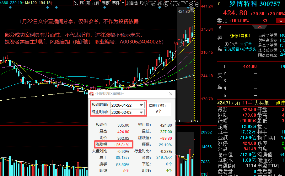 比如我们1月22日分享的罗博特科,它首先是高景气方向,其次走的趋势很漂亮,沿着5日线,回踩10日线震荡上行,强趋势股不会轻易跌破10日线,一旦跌破次日也会区修复,而趋势走弱往往会出现5日线下穿10日线,且次日不修复,这个时候就要及时离场。