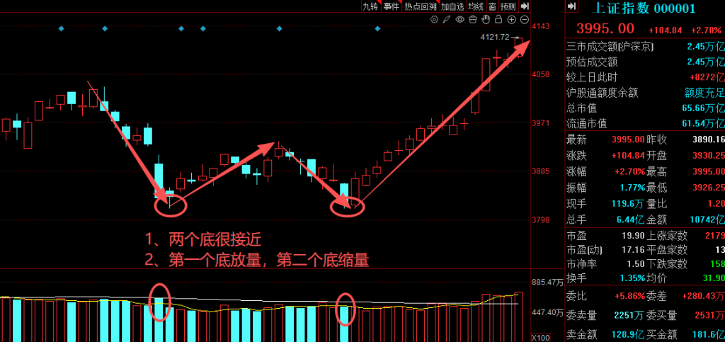 1. 双底低点:价格基本持平,右底不创新低