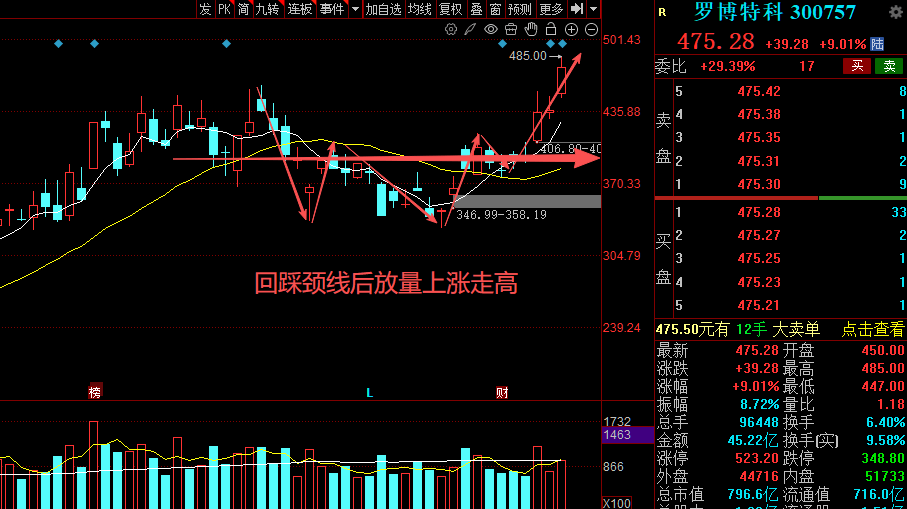 比如我们前几天在内部分享的OCS概念,就属于这种情况,罗博特科3月27日突破颈线,随后几天回踩颈线不破,4月2日我们分享的第二天就启动主升行情。