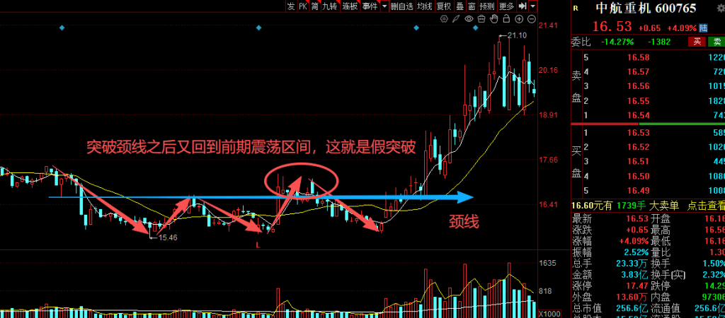 比如近期中航重机的走势,股价突破颈线之后,虽然在颈线附近维持了几天,但是随后震荡回落,又回到双底形成的震荡区间,这就是假突破,一旦股价跌回颈线位内侧2-3天没有收回,立刻止损离场,不要抱有幻想,避免越套越深。