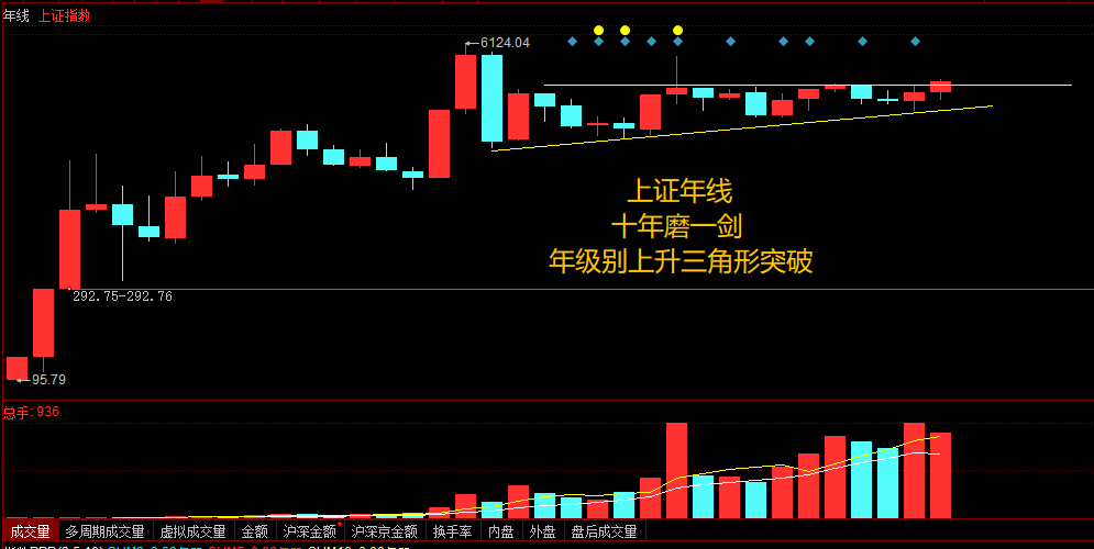 为什么我们说这轮牛市连三分之一都没走到?年线图可以看出,上证指数十年磨一剑,今年开始进入到年级别的上升三角形突破状态之中。上升三角形代表着一段趋势的休整,突破之后则意味着趋势的延续,而这个形态发生在年度这个周期上,所以趋势还将继续。