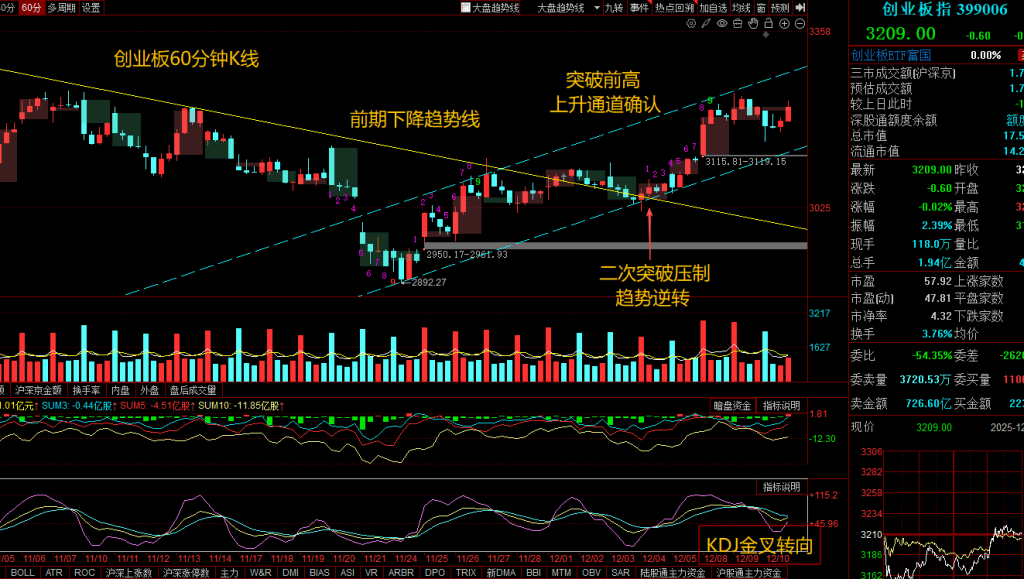 创业板走势强于沪指,60分钟K线形成了非常标准的上升通道,现在K线就是在通道内做折返运动,这个通道的空间就是150个点。按照当前的收盘点位,创业板指数就是3%的波动空间,对应的策略就是,创业板指数累计涨2%或者以上,做减法;创业板指数累计跌2%或者以上,做加法。不需要去猜什么时候突破,突破之后再说突破的事儿,只要60分钟K线还在这个通道内运动,就是下沿附近买,上沿附近卖!
