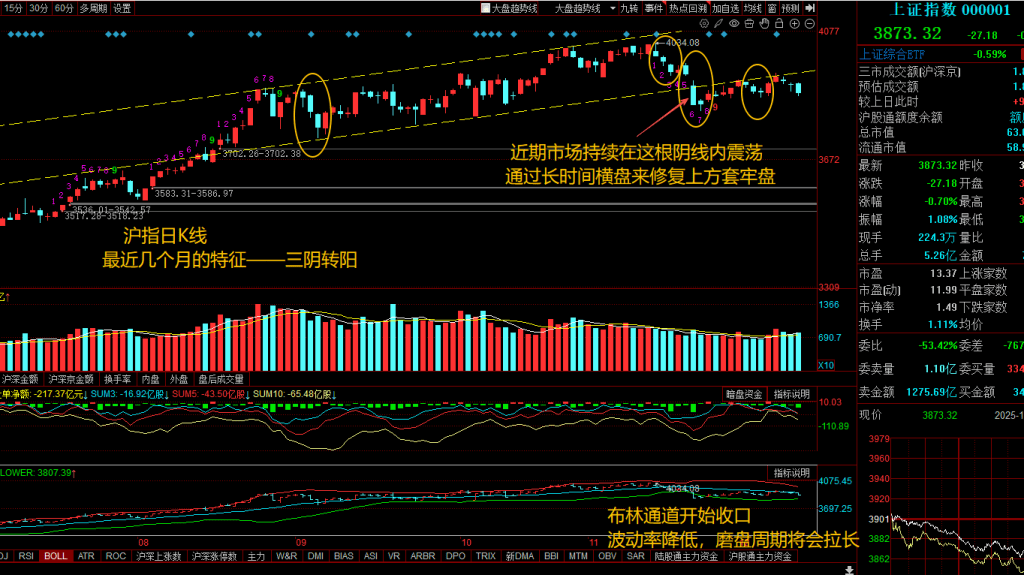 按照昨日分析,创业板的60分钟仍然在上升通道内部折返运动,快逼近下沿,因此按照交易纪律,再继续下行的话又是买点。今天我们主要看沪指,一直没有站上前期上升通道的下轨,多次遭遇阻拦,但要说弱也不是真弱,近期维持在11月21日的阴线内部窄幅震荡。从布林通道收口的表现来看,这个窄幅震荡周期还将进一步拉长,以便消化从4034回落这段时间的套牢筹码。