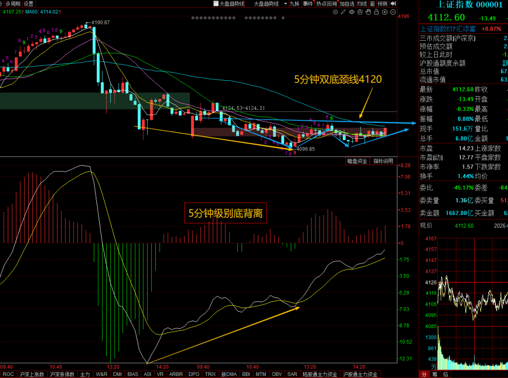 技术上来看,沪指5分钟结构形成底背离,所以下午企稳,没有进一步创新低。但是目前这个底背离暂时没有诱发反弹,只是止住了跌势,同时延伸形成5分钟级别上的W双底,颈线处压力4120,明天就看这个点位能不能上去,才能说反弹能不能开始。