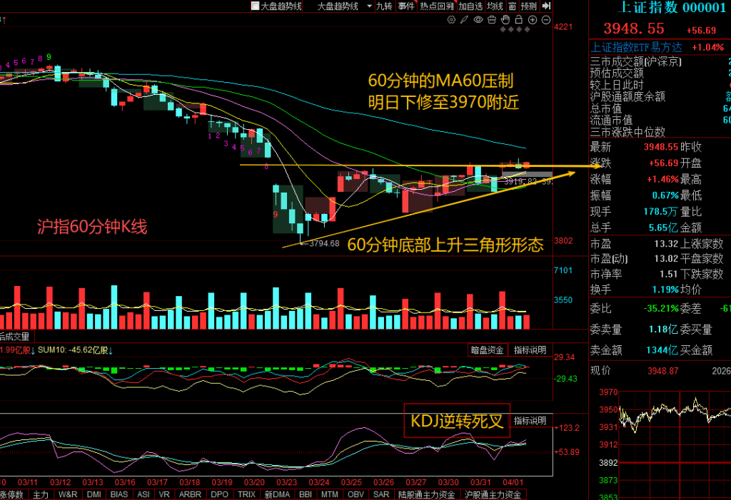 从沪指的60分钟级别来看,出现了比较明显的底部上升三角形形态,目前隐隐有些突破迹象。至于能不能最终成功突破,还要看会不会站上60小时均线,明天下修至3970附近,KDJ出现逆转死叉的多头信号,技术上是比较积极的。