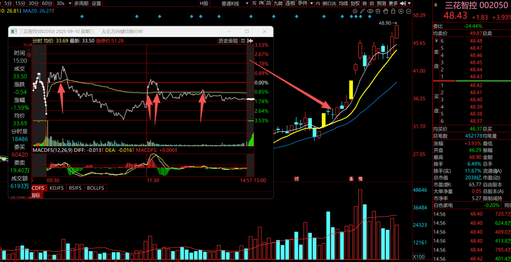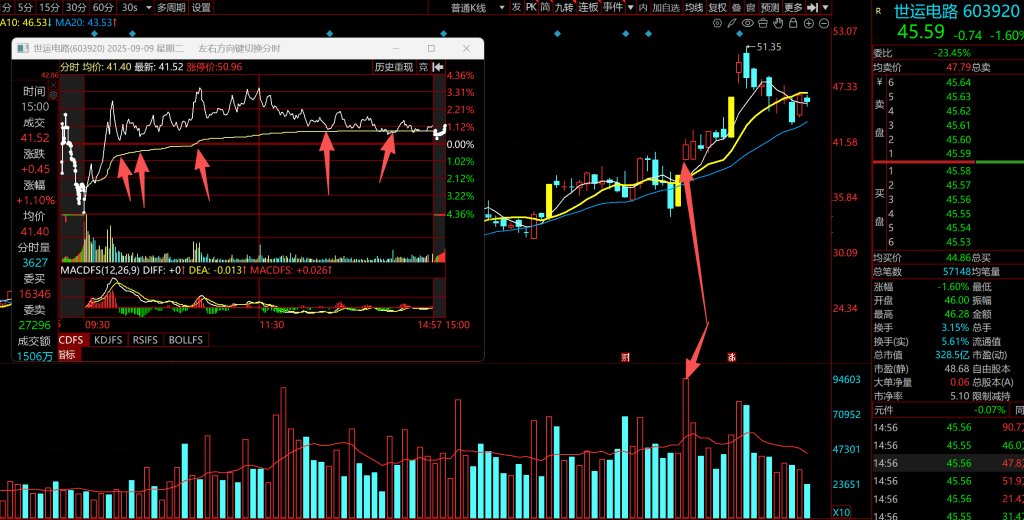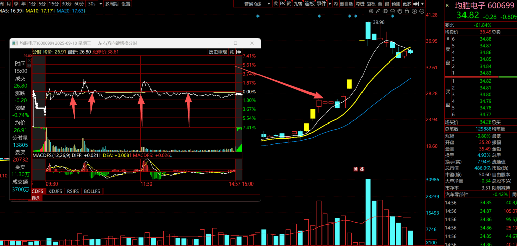 次日弱转强,9月10日的日内分时均线始终保持在-1%上方,符合战法的介入条件
