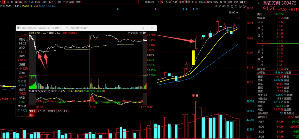 9月11日,存储芯片板块集体启动,香农芯创是整个板块的领涨龙头票。所以将其作为了一柱擎天(转世战法进阶版)的备选票。