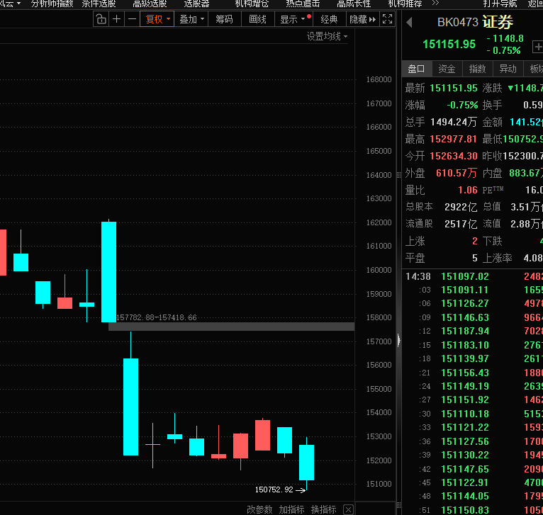 我们来看一下市场中权重股表现:贵州茅台的空方主力只用了半个小时就把多方打趴下了,多方躺在地下连还手的余地都没有。