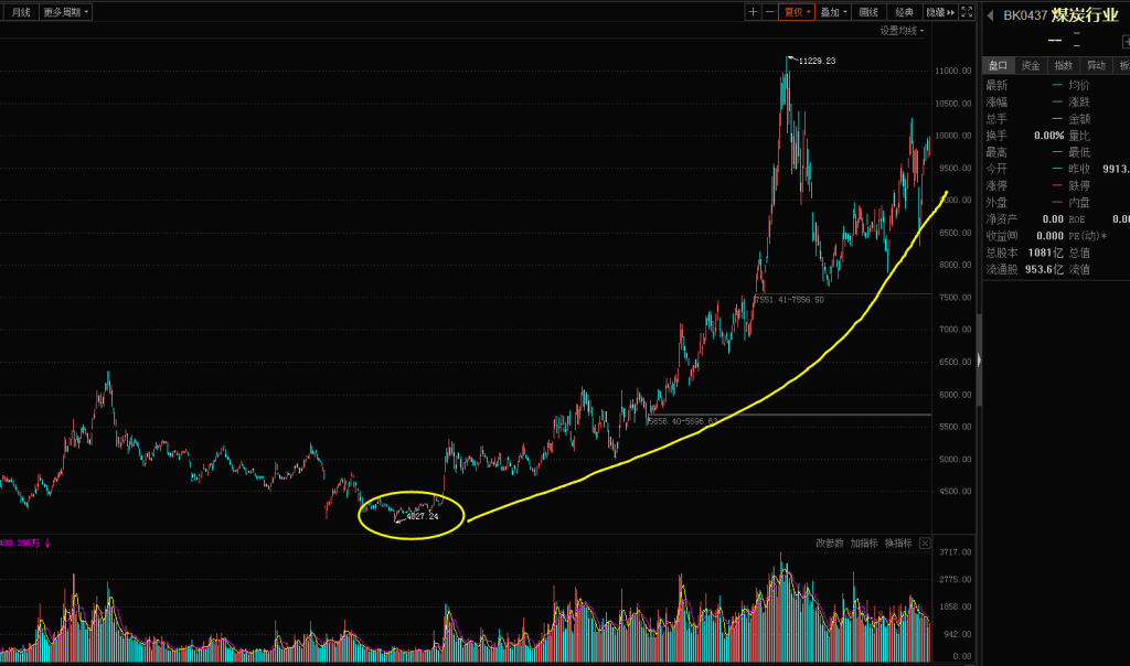 煤炭板块技术走势来看是明显强于指数的,大部分功劳都是中国神华,整个板块目前还是处于中期反弹趋势当中,从20年4月份4027点开始启动中期反弹,并且创出了11229点,已经翻倍的涨幅,而指数调整过程中,煤炭板块表现依然坚挺,中期反弹趋势依然成立,短期来看煤炭板块依然有上冲动能,但已经不是中期布局点位了。