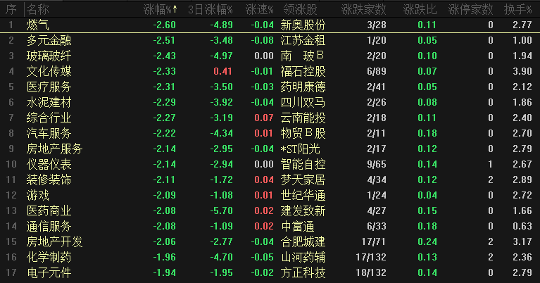 今日板块跌幅靠前的是燃气、多元金融、玻璃纤维、文化传媒、医疗服务、水泥建材、综合行业、汽车服务、房地产服务和仪器仪表等,下跌超过2%的板块达到了15个,板块下跌力度还是比较强的、板块和个股呈现普跌状态,特别是跌停家数依然超过30家,说明个股释放风险欲望还是比较强,短期来看还需要一段时间进行释放,短线游资大幅炒作之后的个股要注意调整风险、一旦开始释放风险会出现快速下跌。