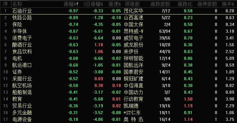 板块跌幅靠前的是石油行业、铁路公路、保险、半导体、消费电子、酿酒行业、食品饮料、电机、航运港口和证券等。下跌板块来看,权重板块形成普跌来压制指数,石油和保险都是领跌的,而板块跌幅来看都没有出现明显大的跌幅,石油、保险和证券都是缩量阴线,也没有出现资金大幅出逃的迹象,短期要观察权重是否能止跌反弹,特别是保险和证券,这都是控制大盘节奏的龙头板块。