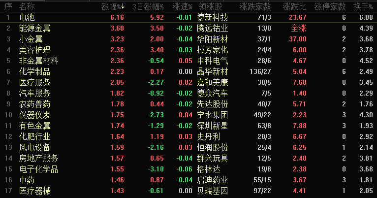 【热点板块】今日板块涨幅靠前的是电池、能源金属、小金属、美容护理、非金属材料、化学制品、医疗服务、汽车服务、农药兽药和仪器仪表等。四维分析来看,行业板块上涨的是有64个,其中有7个板块涨幅超过2%,下跌板块有22个,个股方面,两市上涨家数是3223家,涨停70家,下跌家数是1966家,跌停34家。整体来看,上涨板块和个股还是占据优势、涨停家数也有70家,说明市场还是有一定活跃度的,需要注意的是跌停数量午后开始快速增加。板块来看,以电池为首的新能源板块集体上攻,其中电池板块涨幅超过6%,对于电池板块前期也讲过,这个板块中期超跌之后确实是有反弹的空间,走势确实也是比较强的,电池板块涨幅超过6%,板块有75只个股、其中71只上涨,也有多只涨停的、龙头也是长阳,短期有望保持热度,游资为首的短线资金也需要一个宣泄的板块,科技和机器人降温之后开始炒作电池为首的新能源板块,但是电池板块很难成为行情领涨的龙头,没有办法带领指数形成上攻,只能起到锦上添花的作用,还得需要大金融和科技等龙头板块领涨,还是继续等龙头出现。