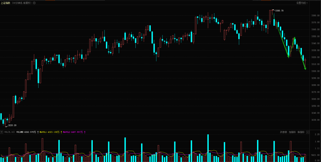 【技术分析】上证指数收出一颗小阴线,只下跌了3.97个指数点,但是这颗小阴线还是比较危险的,日线来看,大盘已经跌破了20日和60日均线、同时5日和10日均线死叉之后开始向下反压,短期一些关键支撑位都跌破了,MACD指标也死叉了,形成了短期的空头信号,这里是已经形成破位还是主力做了一次诱空动作?看一下小周期30分钟来看,从3388点开始调整形成了ABC调整结构,早盘反抽形成B浪、盘中展开了C浪下跌,如果按这个结构来看这一波调整之后还要继续向上反弹,而今天指数冲高回落也是保险和证券板块带动指数走低的,这是主力重要战略板块向下压盘到底什么意图?所以短期可以对于大盘走势保持谨慎,毕竟日线已经有破位的迹象了,但是也要观察这个位置是否是主力资金故意诱空的动作,按这个时间段来看指数连续向下大幅下跌概率也不大,明天和后天走势就很关键,就会揭晓答案。