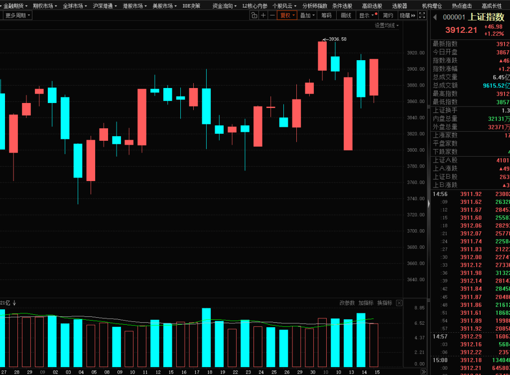 【技术分析】多方这一波是非常想要一波9连阳的,策略都想好了最后1个小时抬升指数练成九阳神功,但是最后1分钟却被偷袭了,收出一颗小阴线,这颗小阴线就是有资金闹情绪的。昨天复盘也讲到了这一波连阳分为两个阶段,第二个阶段就是近期这几颗K线反弹动能逐步衰减、都是逐步缩量的,今天还创出了地量,这是2024年924行情以来新低、两市成交金额仅有9147亿,多重信号下周或将出现一次重要变盘,第一:4月20日周日就是节气谷雨,周末不开盘、节气效应会在下周一开始体现。第二:技术上看一下量价,这一波8连阳只有前面两颗阳线是放量阳线,后面6颗阳线都是逐步缩量的,缩量阳线反弹想过关键阻力位是非常困难的,压力真空区可以向上顶顶,遭遇阻力就很难过去。第三:四大行再次创出历史新高,大市值银行已经用尽全力了,今天尾盘又拉证券和地产,说明多方手里余额已经不足了,暂时能出的牌基本出完了。整体来看,指数已经到了一个关键阶段,现在就寄希望于周末能够有利好消息或者是等待增量资金支援,靠目前的实力已经无法支撑,如果没有利好、也没有增量资金,就要小心下周抛盘会再次涌出。