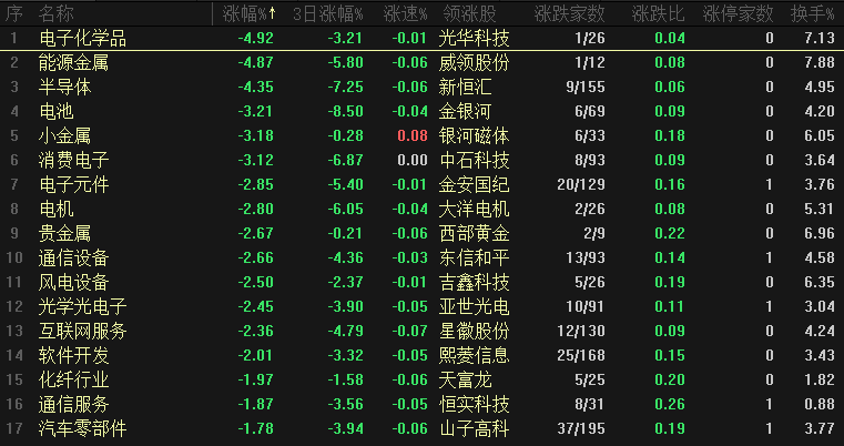 今日板块跌幅靠前的是电子化学品、能源金属、半导体、电池、小金属、消费电子、电机、贵金属和通信设备等,下跌动能主要来自于哪里?板块来看,近期领涨的半导体和电池两大方向都是跌幅靠前、板块跌幅都超过3%,而今天跌幅最大的指数是科创50和创业板50都超过4%,前期带动两大指数反弹的龙头个股集体出现调整,这是下跌主要动能,以创业板为例,流通市值排名前10的大市值个股全线下跌,宁德下跌四个点、中际跌幅超过8%,这类个股短期需要回避。