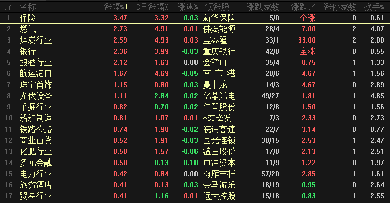 【热点板块】今日板块涨幅靠前的是保险、燃气、煤炭行业、银行、酿酒行业、航运港口、珠宝首饰、光伏设备、采掘行业和船舶制造等。四维分析来看,行业板块有33个上涨,其中有5个板块涨幅超过2%,下跌板块有53个,个股方面,两市上涨家数是1734家,涨停45家,下跌家数是3554家,跌停8家。盘面整体来看,伴随着一批短期强势品种的集体回落、短线资金近期操作都是十分谨慎的,市场热情有所降温,开始经历板块切换的阵痛期。板块来看,保险和银行为首的权重板块开始反弹,这一部分板块都是提前开始出现调整的板块,半导体和电池等题材板块最热的时候、权重板块表现都是比较低迷的,而题材股降温、权重板块开始发力,近期也提示到了银行和保险板块近期开始尝试做止跌,这两个板块止跌反弹的目的是进行防守、指数下跌的时候可以踩刹车,并不是想要带动指数向上突破,如果是真的想要进攻,大金融板块会集体启动、至少证券板块也得是领涨龙头。走势相对较强的是燃气、煤炭和电力等今天都创出了新高,创新高之后调整压力就会加大,整体来看,目前板块没有好的上手机会。