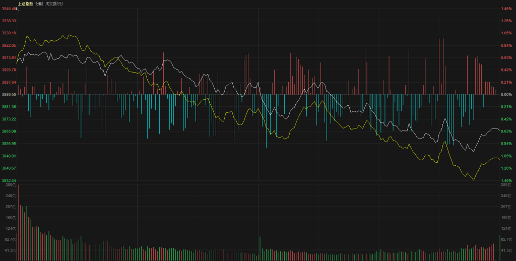 【市场观察】上证指数高开3910点,延续了昨天探底回升的势头,高开之后没有继续高走、反而开始形成震荡,10:30左右指数开始震荡下行,各大指数分时形成标准下跌结构,创业板和科创板是领跌的,上证指数因为几个大市值权重在做抵抗、跌幅相对较小,而其他指数跌幅都是逐步扩大,最终上证指数报收3865点,下跌0.62%,创业板指数报收2955点,下跌3.99%。