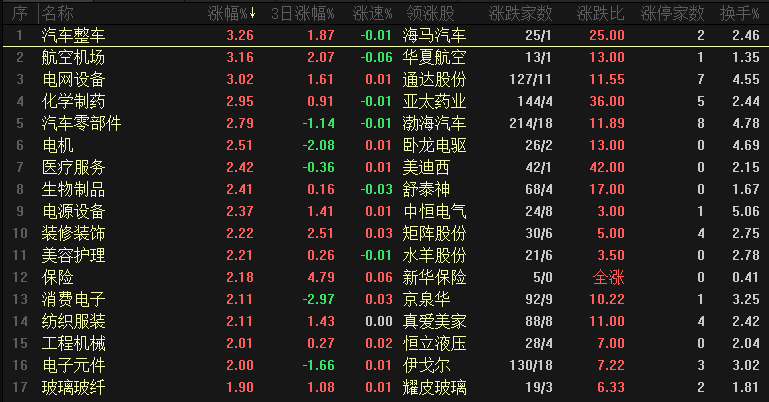 【热点板块】今日板块涨幅靠前的是汽车整车、航空机场、电网设备、化学制药、汽车零部件、电机、医疗服务、生物制品、电源设备和装修装饰等。四维分析来看,行业板块有82个上涨,其中有16个板块涨幅超过2%,下跌板块有3个,个股方面,两市上涨家数是4333家,涨停82家,下跌家数是950家,跌停7家。盘面整体来看,短期持续震荡调整、特别是反弹龙头集体调整导致市场人气出现低迷的迹象,今天资金有意识的开始想要修复盘口,整体看也是一种控温的动作,前期温度过高、会选择降温,近期温度低、也开始升温。板块来看,今天板块形成普涨行情,但是依然没有明确的方向、持续性也不理想,近期整体来看,资金主要布局的方向是低位权重板块,从有色金属、煤炭、钢铁、电力,到今天的汽车整车、航空机场等都是属于低位权重板块补涨,以航空机场为例,25年还是下跌状态,近期反弹之后有几只才勉强收红,南航今年还是下跌状态,所以这一类板块是属于低位补涨、并不是中期主升结构,补涨反弹的强度会相对较弱,包括一些消费板块也是属于低位补涨。