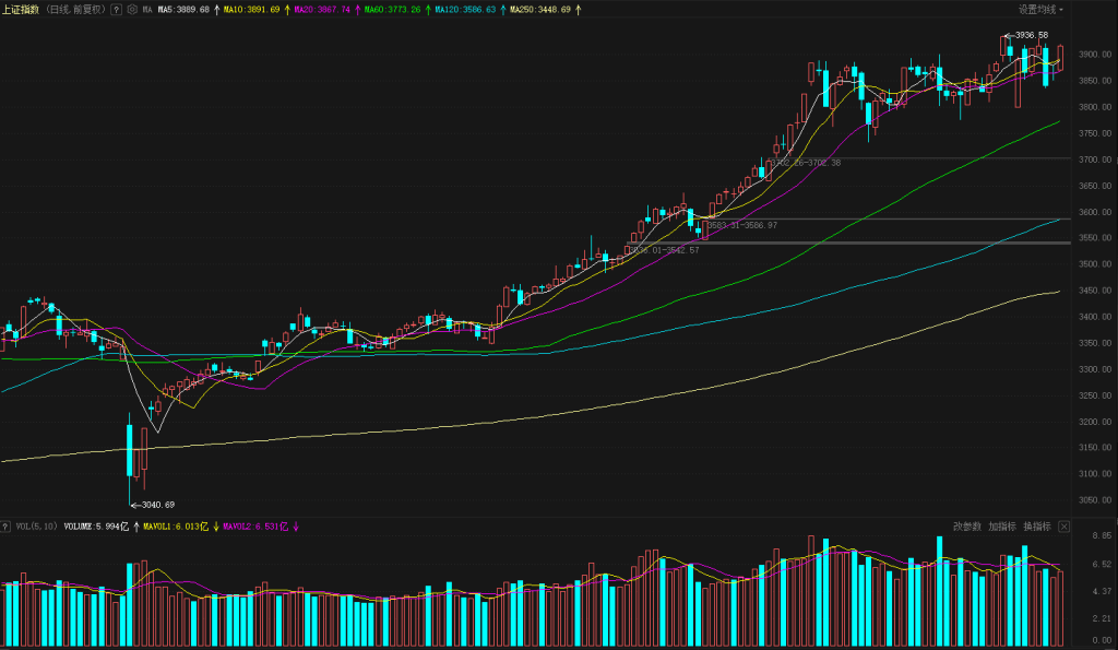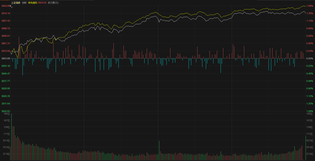 【市场观察】上证指数高开3870点,开盘之后指数维持震荡上扬的走势、黄白线同时上扬,今天黄白线走势完全同步,这是一个标准的分时反弹结构,股指期货分时走的也很强,依托分时均价线稳步上扬,这是近期分时走势最稳定的一个交易日,最终上证指数报收3916点,上涨1.36%,创业板早盘也是震荡上行,但是13:30之后盘中出现滞涨信号、开始小幅回落,最终报收3083点,上涨3.02%。