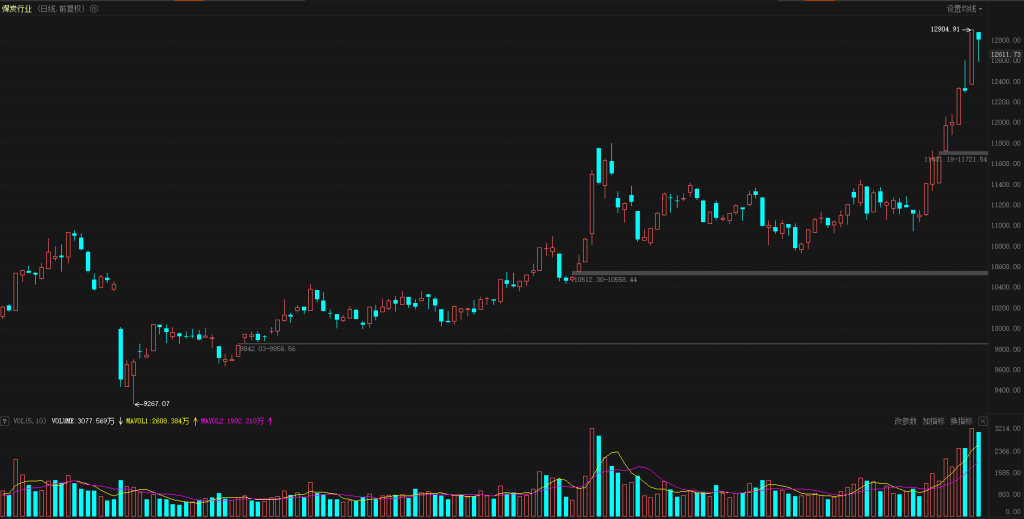 今日板块跌幅靠前的是煤炭行业、燃气和贵金属,只有三个板块下跌,近期领涨的煤炭行业和燃气出现小幅调整,煤炭板块第一个阶段是几只龙头个股带动板块持续上涨,属于集体上涨阶段,现在进入到第二个阶段开始形成分化,涨停的只有1只了,其他个股也开始分化,这就是近期讲到的低位权重板块走的是小波段行情,游资主导的几只龙头开始调整、板块也会快速降温,操作要及时锁定利润、这和科技等中长期主线操作策略是不一样的。