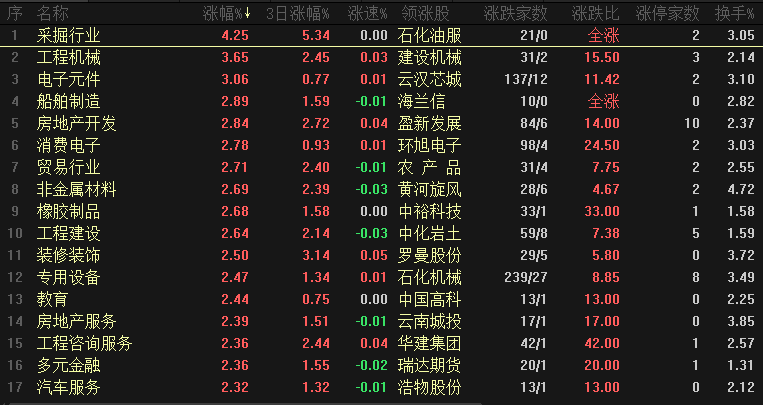 【热点板块】今日板块涨幅靠前的是采掘行业、工程机械、电子元件、船舶制造、房地产开发、消费电子、贸易行业、非金属材料、橡胶制品、工程建设等。四维分析来看,行业板块有83个上涨,其中有27个板块涨幅超过2%,下跌板块有3个,个股方面,两市上涨家数是有4628家,涨停92家,下跌家数是729家,跌停5家。盘面整体来看,资金修盘口效果还是比较明显的,连续两天形成普涨格局,但是近期反弹没有出现明确的领涨主线,今天领涨的是采掘行业、工程机械等,现在形成低位权重板块轮动行情,近期从金属开始、到煤炭、钢铁、采掘、工程机械都是有所动作,包括房地产开发也是有所动作,都是权重低价股的补涨,低价板块炒作特点是几只小市值个股涨停带动板块指数上涨,但是大部分都是跟风上涨,涨幅并不大,以房地产开发板块为例,板块指数已经创出了近几年的新高,而还有一大批房地产都没有涨,所以近期板块轮动不能说没有机会、但这种打地鼠的行情很难操作。