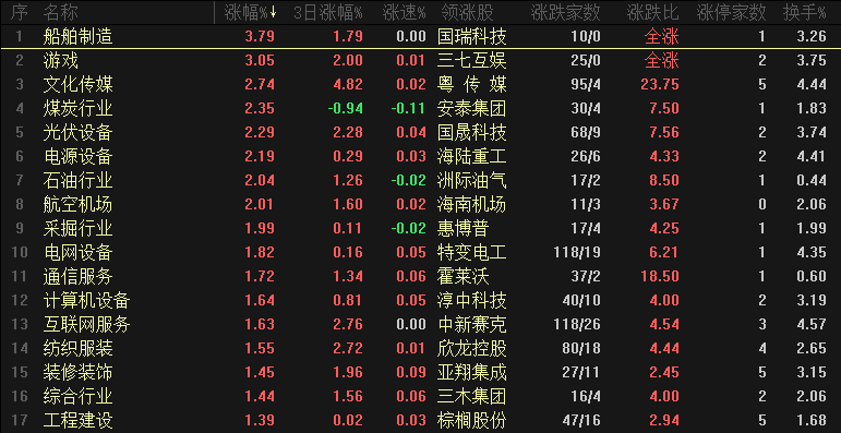 【热点板块】今日板块涨幅靠前的是船舶制造、游戏、文化传媒、煤炭行业、光伏设备、电源设备、石油行业、航空机场、采掘行业和电网设备等。四维分析来看,行业板块有76个上涨,其中有8个板块涨幅超过2%,下跌板块有10个,个股方面,两市上涨家数是3535家,涨停90家,下跌家数是1801家,跌停11家。盘面整体来看,上涨和涨停家数有所增加,资金还在继续修复盘口,力争让市场处于相对强势的状态。板块来看,近期领涨板块出现了一些变化,本轮涨幅较小的板块开始发力,包括中海油、中石油涨幅都超过4%,中海油一直维持震荡结构、没有跟随指数上涨,10月底才开始上涨,这是一个补涨的特征,银行、煤炭和电力等板块走势是十分相似的,这一批高股息的品种持续调整之后近期开始出现活跃,这一批板块为何开始上涨?题材类板块形成了一波轮动行情,题材板块几乎都涨了一遍、当前都是处于高位,已经没有上手点了,所以资金开始转向了业绩稳定、高分红的品种、特别是踏空资金想要进场只能是这个方向了,但是这一批个股当前只是补涨行情、而不是中长期反弹,这板块个股短期有机会、但不能预期太高。