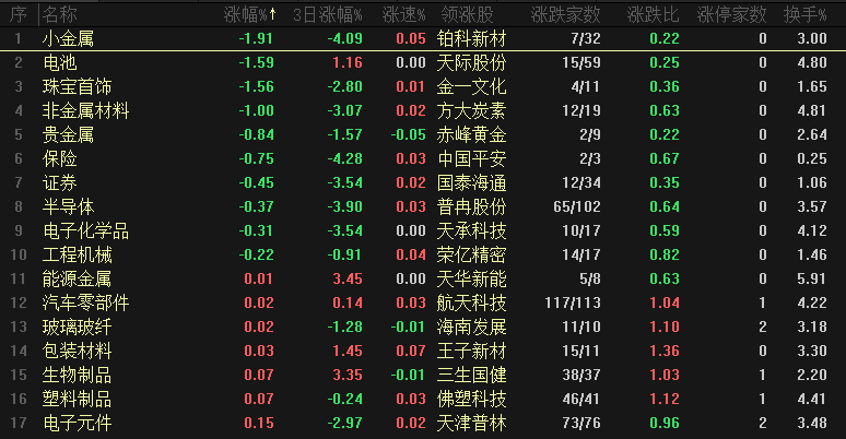 今日板块跌幅靠前的是小金属、电池、珠宝首饰、非金属材料、贵金属、保险、证券、半导体和电子化学品等,小金属和电池是近期强势板块、电池板块创出了新高,出新高之后也形成了过顶洗,近期很多板块都出现了过顶洗的动作,所以对于创新高的板块和个股要注意调整风险。保险和证券继续调整,这两个龙头持续调整也说明了当前主力还是以防守为主、没有主动进攻的动作,关注这两个重要风向标什么时候会出现止跌反弹。