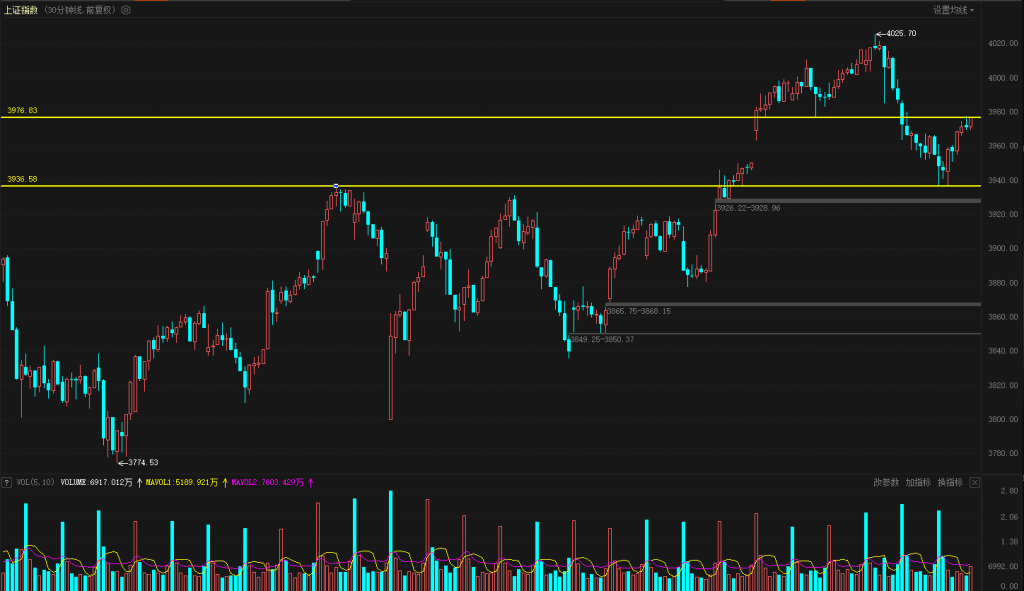 【技术分析】本周的周线怎么收是非常关键的,所以多方在周一就开始发力,出击的方向是权重板块,一线、二线和三线权重都是有所表现的,主要目的就是为了向上顶指数,盘中已经跌破了10日均线、多方第一个防守位置就是依靠10日均线做防守,这个位置如果失守就会考验下一个支撑、第二个防守位置是3926点附近,这里是20日均线的位置、同时也有缺口支撑,目前整体策略来看多方还是防守的姿态,先把指数稳住,这一颗阳线还没有出现进攻信号,上证指数30分钟走势非常清晰,4025点开始调整在3936点获得支撑,3936点是10月9日的高点、突破之后压力转为支撑,技术形成支撑位,而向上的压力是3976点,最终收盘的位置也正好在这个点位,短期任务目标就是站稳3976点、再等待向上的机会。创业板也是收出一颗阳线,但是护盘并不坚决,盘中一度跌破了10日和20日均线,短期创业板走势相对弱一点。