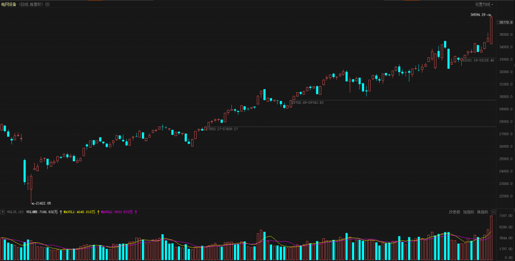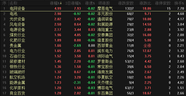 【热点板块】今日板块涨幅靠前的是电网设备、电池、光伏设备、风电设备、电源设备、煤炭行业、化肥行业、贵金属、电力行业和石油行业等。四维分析来看,行业板块有75个上涨,其中有5个板块涨幅超过2%,下跌板块有11个,个股方面,两市上涨家数是3380家,涨停83家,下跌家数是1905家,跌停7家。盘面整体来看,资金继续修复盘口、涨停个股超过80家,还是力争保持市场活跃度。板块来看,今天热点集中在能源板块,包括新能源电网设备、电池、光伏设备、风电设备和电源设备等,传统能源煤炭、电力和石油也是集体上涨,能源板块集体异动还是比较罕见的,能源板块启动一方面是因为近期相关利好消息刺激、另一方面也是资金战略需要,仅仅依靠福建、海南等地域板块炒作是不能稳住指数、市场活跃度也不够。电网设备、煤炭和电力等板块近期都是创出了新高,电网设备中长期震荡上行之后出现加速上行的走势,一旦短期出现加速反弹、就要小心是否会出现加速见顶的动作,出现滞涨信号就是降成本机会。
