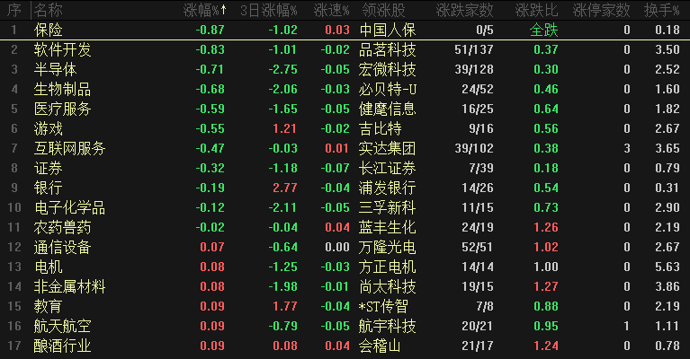今日板块跌幅靠前的是保险、软件开发、半导体、生物制品、医疗服务、游戏、互联网服务、证券和银行等,金融和科技两大板块同时出现调整,这是A股市场最重要的两大方向,两大龙头集体调整也说明当前并不是强势反弹的特征,还是震荡结构,能源板块集体反弹能够起到一定作用、但是无法取代金融和科技板块的地位,保险板块作为行情的信号灯、短期重心是逐步下移的,午后也没有反弹的动作,这个信号是要给与关注。