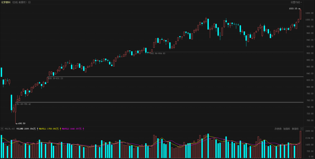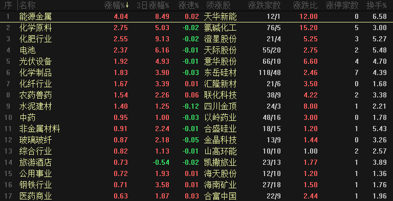 【热点板块】今日板块涨幅靠前的是能源金属、化学原料、化肥行业、电池、光伏设备、化学制药、化纤行业、农药兽药、水泥建材和中药等。四维分析来看,行业板块有38个上涨,其中有4个板块涨幅超过2%,下跌板块有47个,个股方面,两市上涨家数是2101家,涨停63家,下跌家数是3162家,跌停8家。盘面整体来看,上涨和涨停家数都开始减少、市场情绪逐步降温,热点炒作周期都比较短暂、资金参与热情不高。板块来看,今天化学、化工类的板块出现集体上涨,化学原料、化肥行业和化学制药等都是涨幅靠前,概念板块来看,有机硅、氟化工、钛白粉和磷化工等也是集体上涨,这类板块上涨一方面是有利好消息的刺激、带动相关板块上涨,同时也是属于低位板块补涨行情,大周期类板块都是先后完成了补涨,最强的是有色金属,其次是煤炭、钢铁和化工等都先后完成了补涨,既然是补涨并不是中长期的反弹、还是属于波段行情,短期拉上去开始放量或者出现滞涨信号就需要及时降成本。中药板块也是涨幅靠前,中药板块当中也还有一批低位品种等待补涨,这类低位品种可以关注、可能短期有一个补涨的过程。