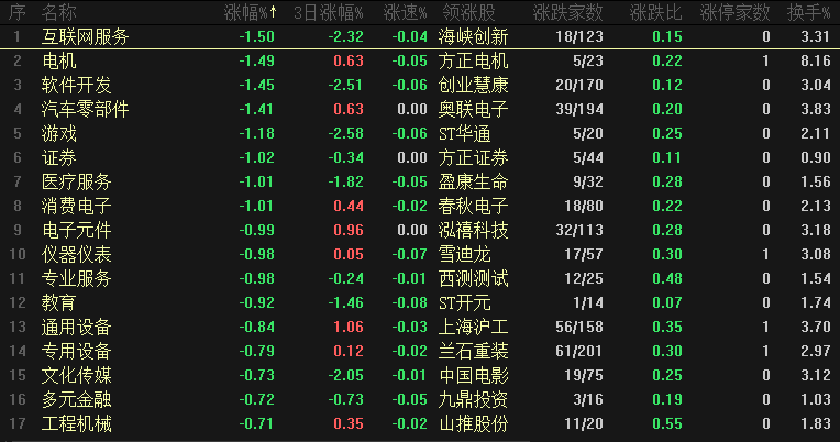 今日板块跌幅靠前的是互联网、电机、软件开发、汽车零部件、游戏、证券、医疗服务、消费电子和电子元件等,板块整体跌幅并不大、都是小幅调整,领跌的都是人气龙头板块,包括互联网、电机、软件开发、汽车零部件、游戏、证券等都是带人气的板块,这类板块集体调整也说明当前市场情绪并不高,当前是低位板块轮动、如果能跟上节奏可以跟着主力吃一口短线,如果适应不了这种快速轮动也可以不参与、保持自己的节奏。