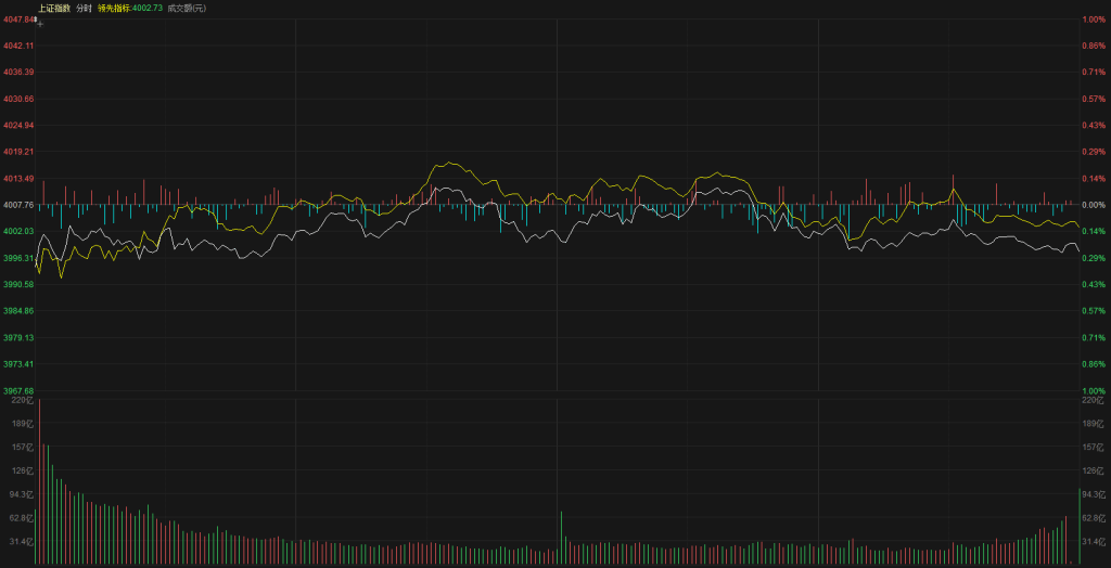 【市场观察】上证指数低开3994点,开盘之后没能延续昨天反弹势头、形成低位震荡的走势,盘中也曾尝试进行一波上攻、但是资金依然不配合,最高上冲到4012点之后开始震荡下行,整体来看黄白线走势都是比较混乱、属于典型震荡结构的走势,今天尾盘也没有出现上冲的迹象,最终上证指数报收3997点、没能站上4000点关口,下跌0.25%,创业板指数报收3208点,下跌0.51%。