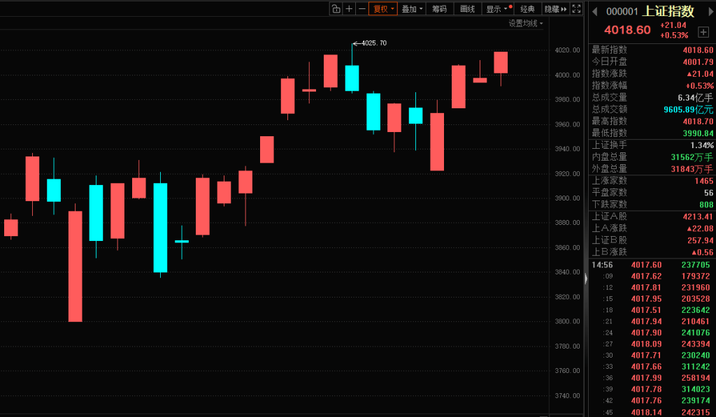 【市场观察】上证指数小幅高开4001点,盘中多空双方围绕4000点来回争夺,整个早盘2个小时都是维持窄幅震荡的走势,下午开盘之后指数开始震荡上行,消费板块龙头个股集体上涨带动大盘走高、黄白线同时上涨,这一波反弹也有资金小幅流入的迹象,最终上证指数报收4018点,上涨0.53%,创业板指数没有跟随大盘上涨,高开之后形成一波跳水,维持低位弱势震荡的走势,最终报收3178点,下跌0.92%。