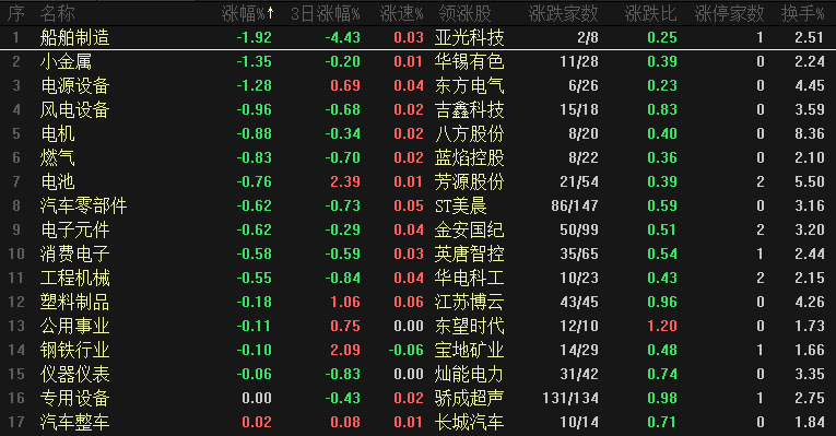 今日板块跌幅靠前的是船舶制造、小金属、电源设备、风电设备、电机、燃气、电池、汽车零部件和电子元件等,上周涨幅靠前的板块开始出现调整,现在资金板块操作思路就是不停的切换,高位板块和个股资金兑现利润之后、挖掘低位品种,板块整体跌幅都不大、但是部分个股资金流出较为明显,包括小金属、电源设备、风电设备、超导等板块中一些个股资金流出量较大,高位个股要注意调整风险。