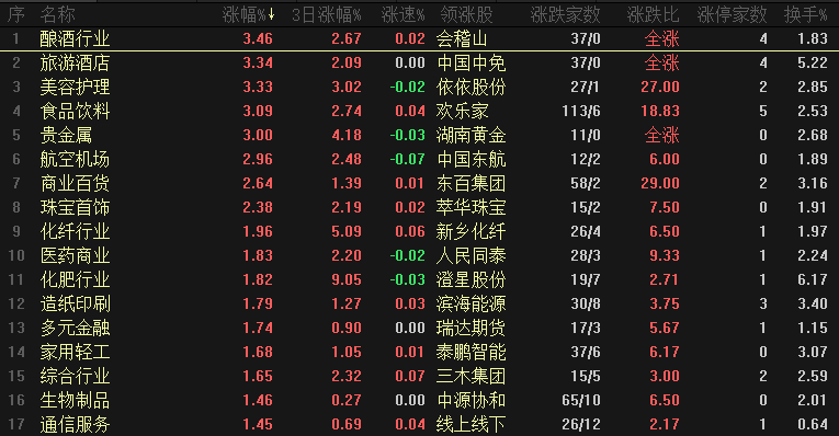 【热点板块】今日板块涨幅靠前的是酿酒行业、旅游酒店、美容护理、食品饮料、贵金属、航空机场、商业百货、珠宝首饰、化纤行业和医药商业等。四维分析来看,行业板块有70个上涨,其中有8个板块涨幅超过2%,下跌板块有15个,个股方面,两市上涨家数是3376家,涨停92家,下跌家数是1957家,跌停10家。盘面整体来看,涨停家数增长到了92家,个股活跃度还是不错的,近期还是有一些小热点、想要维持市场热度。板块来看,酿酒行业、旅游酒店、食品饮料、商业百货等大消费板块集体启动,大消费板块已经很久没有出现集体反弹了,今天为何成为领涨板块?主要有三个原因,第一:近期消息面开始出现利好,核心CPI数据持续上行、场景消费、反内卷等都是利好消费板块,第二:本轮A股板块持续轮动推动指数的上行,大金融、科技、周期等几个大方向都已经完成了一轮上涨,只有大消费板块还是在低位震荡,现在上涨也是补涨的性质,第三:指数走到这个位置大金融上涨乏力、资金开始尝试切换到消费板块带领指数上涨,现在资金也开始关注到了大消费板块,下一个阶段要关注大消费板块反弹持续性。