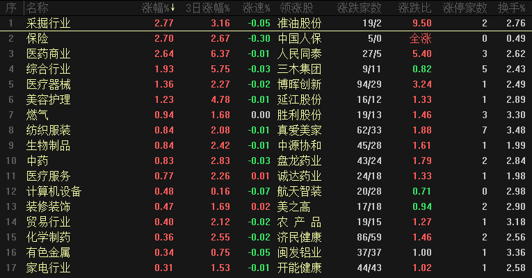 【热点板块】今日板块涨幅靠前的是采掘行业、保险、医药商业、综合行业、医疗器械、燃气、纺织服装、生物制品和中药等。四维分析来看,行业板块有23个上涨,其中有3个板块涨幅超过2%,下跌板块有63个,个股方面,两市上涨家数是1758家,涨停77家,下跌家数是3563家,跌停10家。盘面整体来看,上涨板块和个股持续减少、市场活跃度进一步降低,各路资金都呈现流出状态。板块来看,今天反弹板块分为两类,第一类保险、银行和石油,大权重板块反弹目的主要是为了稳指数,大盘还能站在4000点就是依靠这些大市值品种,这是多方的防守策略,第二类就是医药板块集体板块,医药商业、医疗器械、免疫治疗等,医药板块集体上涨说明资金选择防御性板块,这两大类其实都是具备防御特征,这是盘口转弱的信号。下一个阶段可以关注一下医药板块,大消费板块没有形成集团军的机会,但是医药一些细分板块还是有操作机会的,可以关注中长期处于低位、具有底部结构的医药板块,这个时间段医药板块是有炒作逻辑的。