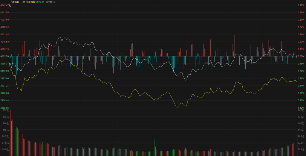 【市场观察】上证指数低开3996点,开盘直接跌破了4000点,多方开始日内第一次护盘,银行和保险板块携手拉升带动指数震荡上行、最高点上冲到了4020点,白线拉上去、但是黄线没有跟涨,10:30之后出现一波震荡下行,盘中再次跌破4000点、最低触及3980点,午后形成第二次护盘、但是这一次向上力度更弱,最终上证指数报收4000点,下跌0.07%,创业板指数报收3122点,下跌0.39%。