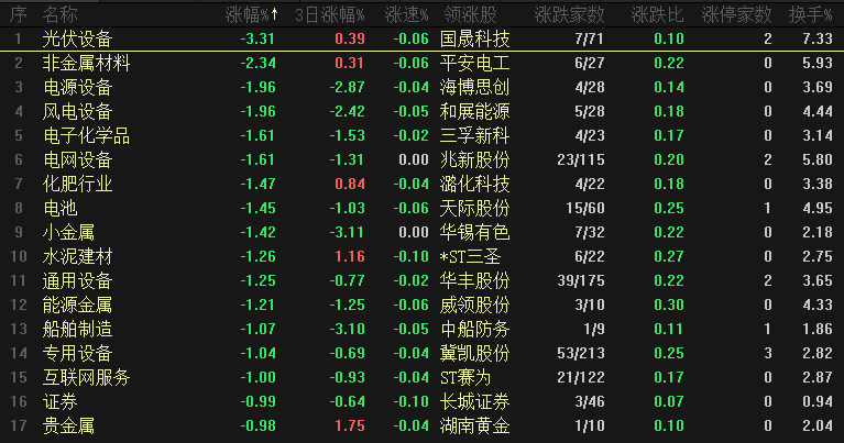 今日板块跌幅靠前的是光伏设备、非金属材料、电源设备、风电设备、电子化学品、电网设备、化肥行业、电池和小金属等,跌幅靠前的都是前期活跃板块、短期一波上涨之后开始出现调整,光伏板块短期创出新高之后也出现大幅调整,板块和个股处于高位的必然需要有一个风险释放的过程,即使指数能够稳住、这类品种也需要找机会进行释放,所以高位品种短期一定要回避,特别是市场高人气板块、在防守阶段通常表现都会比价低迷,市场人气复苏之后这类板块才会有机会。