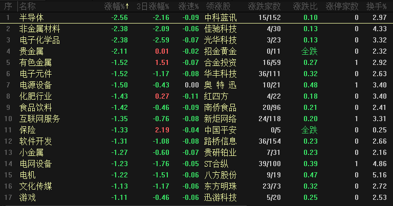 今日板块跌幅靠前的是半导体、非金属材料、电子化学品、贵金属、有色金属、电子元件、贵金属、有色金属、电子元件、电源设备和化肥行业等,科技板块集体调整,这一批板块前期持续上涨之后短期都是处于高位、具有调整需求,为什么昨天资金选择新能源当做反弹龙头、是因为短期科技板块压力比较大,以半导体板块为例,10月9日创出新高之后一直维持震荡调整的结构,个股资金流出幅度也比较大,短期注意回避。