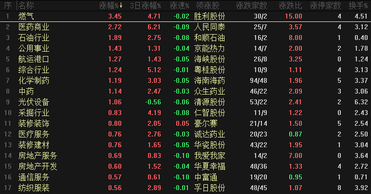 【热点板块】今日板块涨幅靠前的是燃气、医药商业、石油行业、公用事业、航运港口、综合行业、化学制药、中药、光伏设备和采掘行业等。四维分析来看,行业板块有29个上涨,其中有2个板块涨幅超过2%,下跌板块超过56个,个股方面,两市上涨家数是1961家,涨停89家,下跌家数是3323家,跌停9家。盘面整体来看,下跌家数增长到了3300家、市场情绪有所降温,板块和个股调整相对柔和、属于合理的调整范围。板块来看,今天上涨的都是防御性板块,包括燃气、石油、医药商业、公用事业和港口等,近一段时间来看主力流入的大方向还是偏向于防御板块,低位补涨+消息刺激还是资金的首选,燃气、石油和医药商业等这几个都是低位板块补涨,整体是处于中长期低位、等待消息刺激短期快速拉升,下一个阶段还是要按这个思路去选择板块和个股,还有一小部分个股还有补涨机会的。