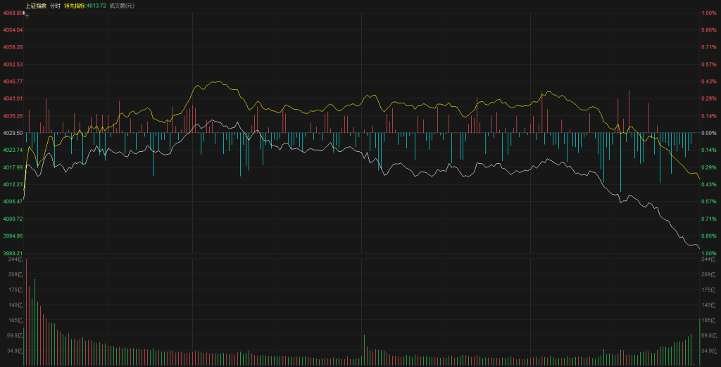 市场观察】上证指数低开4007点,低开是因为外盘下跌给A股带来一定影响,低开之后震荡上行创出日内高点4034点,这是延续了昨天的反弹势头、再次创出了新高,创新高之后反弹动能衰竭,开始形成震荡下行的走势,14:00之后出现一波加速下跌,黄白线同时下跌、并且白线是领跌状态,最终上证指数报收3990点,下跌0.97%,创业板指数低开之后震荡、尾盘也是跟随跳水,最终报收3111点,下跌2.82%。