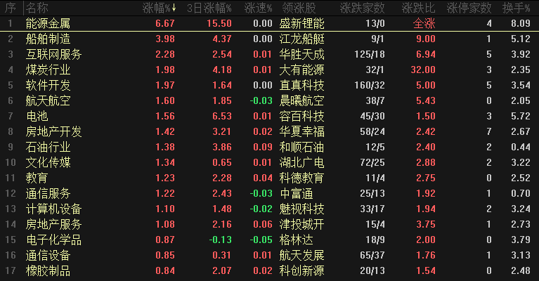 【热点板块】今日板块涨幅靠前的是能源金属、船舶制造、互联网服务、煤炭行业、软件开发、航天航空、电池、房地产开发、石油行业和文化传媒等。四维分析来看,行业板块有47个上涨,其中有3个板块涨幅超过2%,下跌板块有39个,个股方面,两市上涨家数是2584家,涨停100家,下跌家数是2726家,跌停10家。盘面整体来看,个股涨跌比是持平状态,涨停家数依然达到了100家,说明短线资金还是保持活跃的状态,但是近期资金炒作的热点十分散乱,从炒消息、炒地域又到炒名字,这些炒作说明市场目前没有确定主线、资金都是各自为战。板块来看,今天领涨的是能源金属,能源金属还是保持反弹趋势之中,期货碳酸锂震荡上行之后今天直接涨停,刺激碳酸锂相关上市公司集体大涨,这是近期反弹持续性比较好的板块,而船舶制造、互联网服务、煤炭行业、软件开发、航天航空等板块上涨也是因为特殊事件刺激引发的,这种事件存在较大不确定性、未来这些板块炒作能否持续反弹也得继续观察,资金入场也并不坚决。